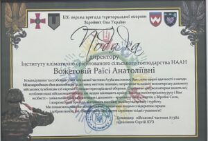 Членкиня Конгресу ділових жінок України, директорка Інституту кліматично орієнтованого господарства НААН- Вожегова Раїса Анатоліїна отримала подяку за активну життєву позицію, патріотизм та волонтерську допомогу військовослужбовцям окремої 126-ї бригади ТРО.